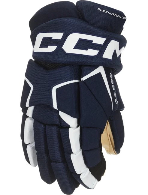 Gants de hockey sur glace Les CCM Tacks AS 580 JR en bleu foncé et blanc sont produits dans des tailles 10, 11 et 12 pouces.