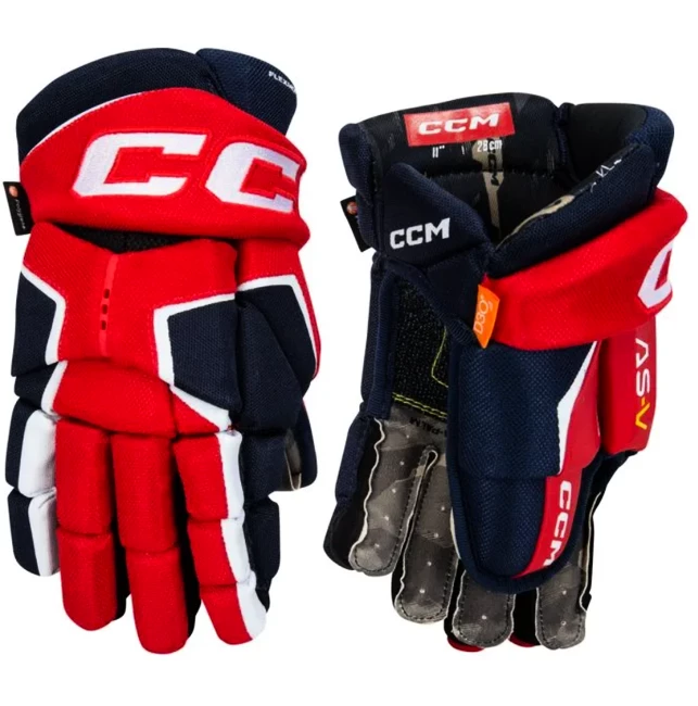 Les gants bleu foncé-rouge-blanc sont fabriqués en tailles 10, 11 et 12 pouces.