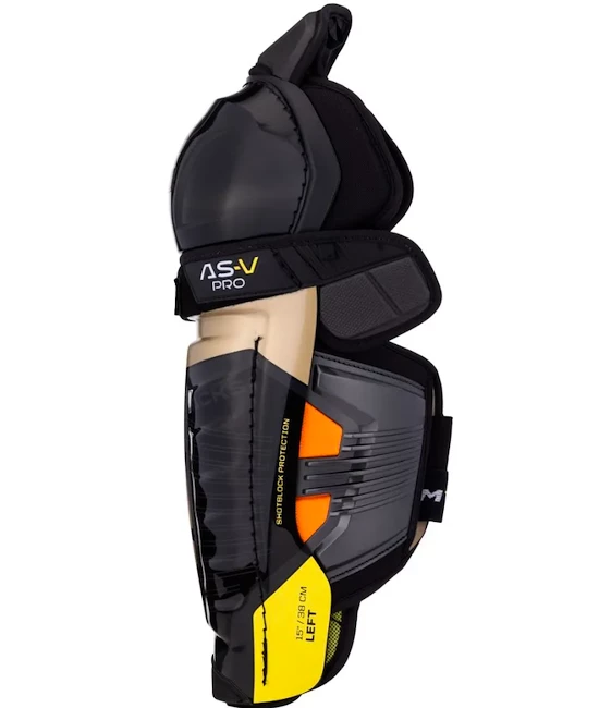 Les tibias CCM Jambières AS-V PRO SR sont produits dans les tailles 14, 15, 16 et 17 pouces.